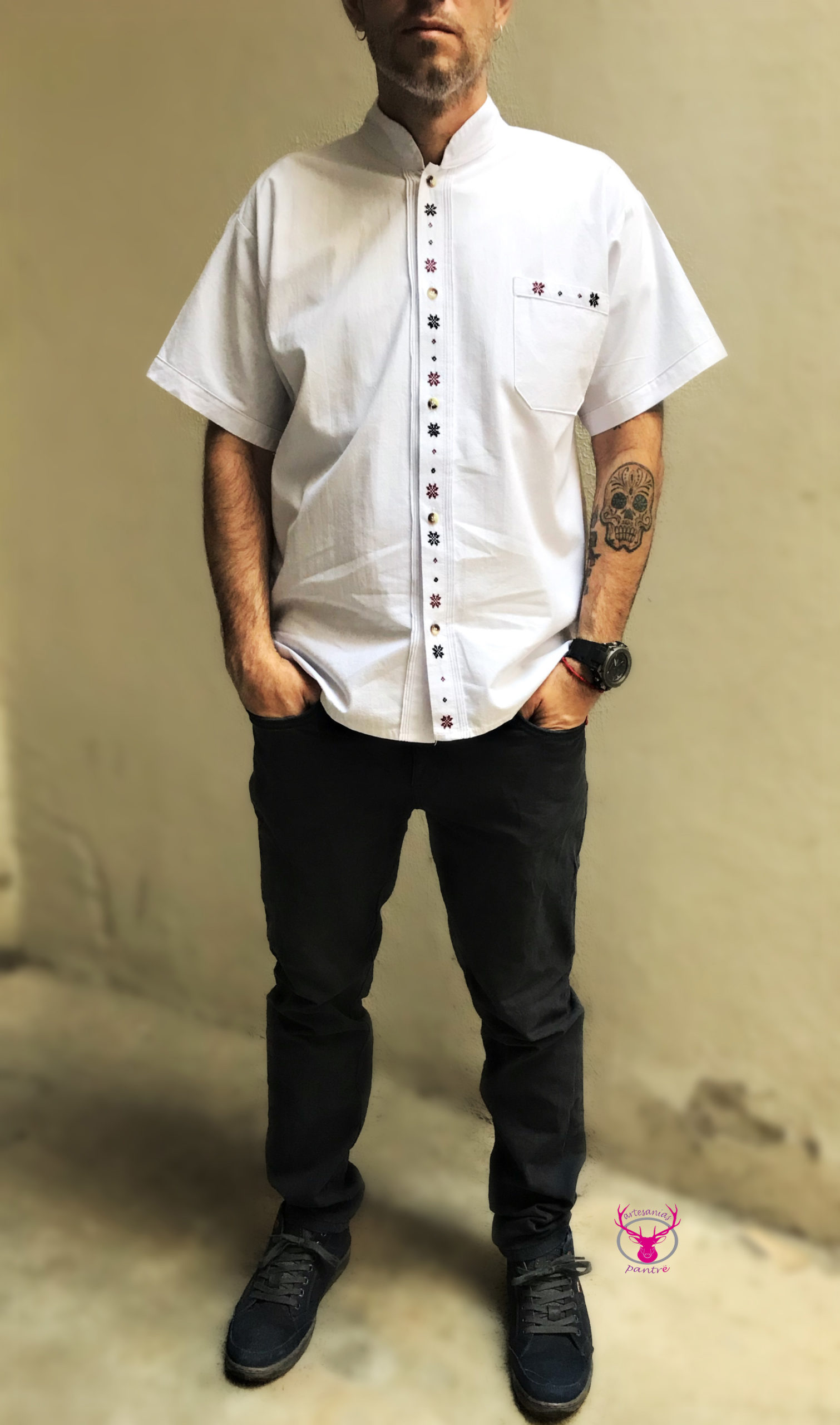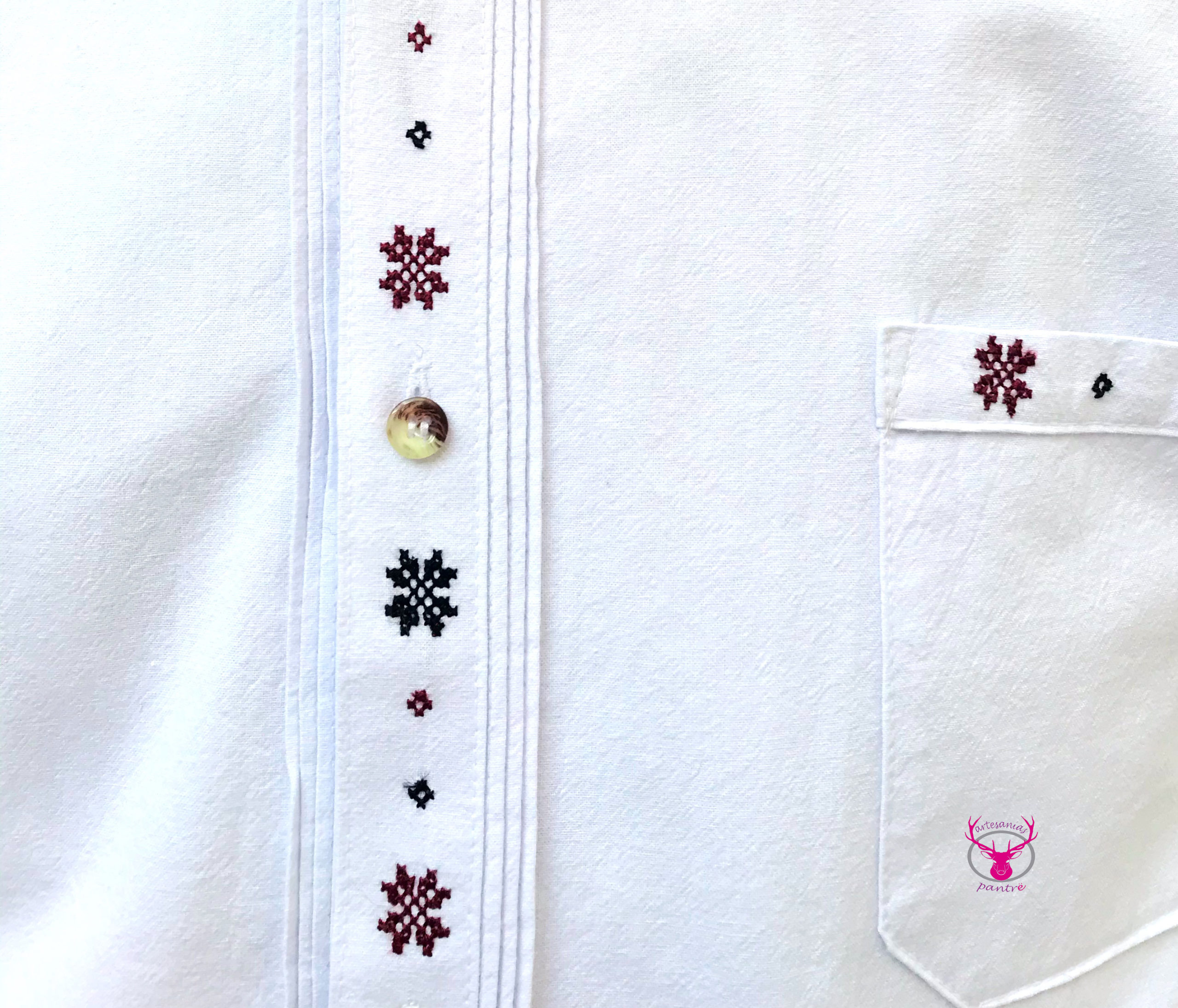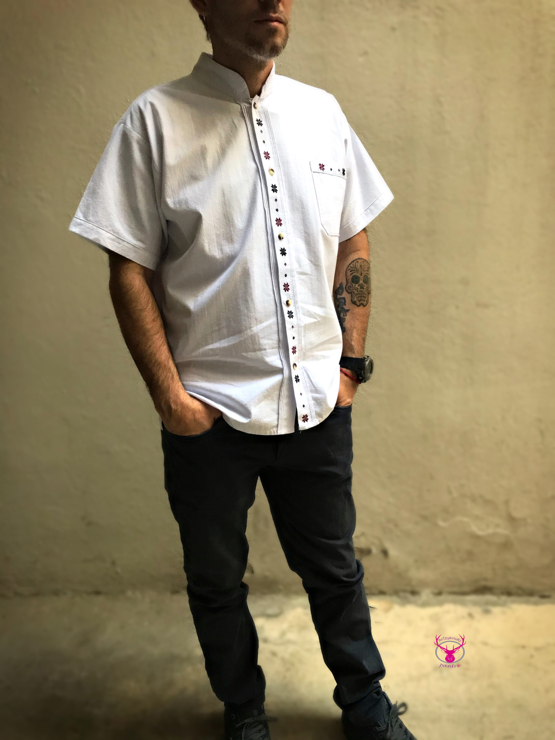 Camisa de manta de algodón, bordada totalmente a mano.