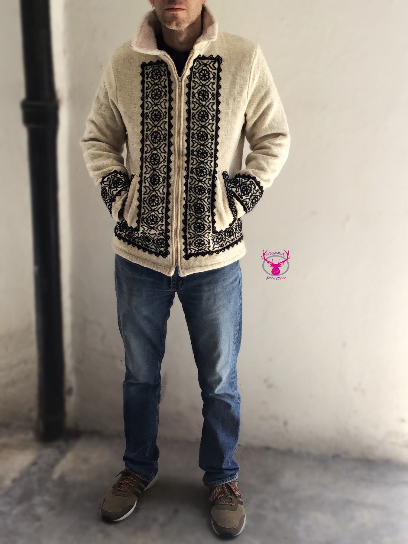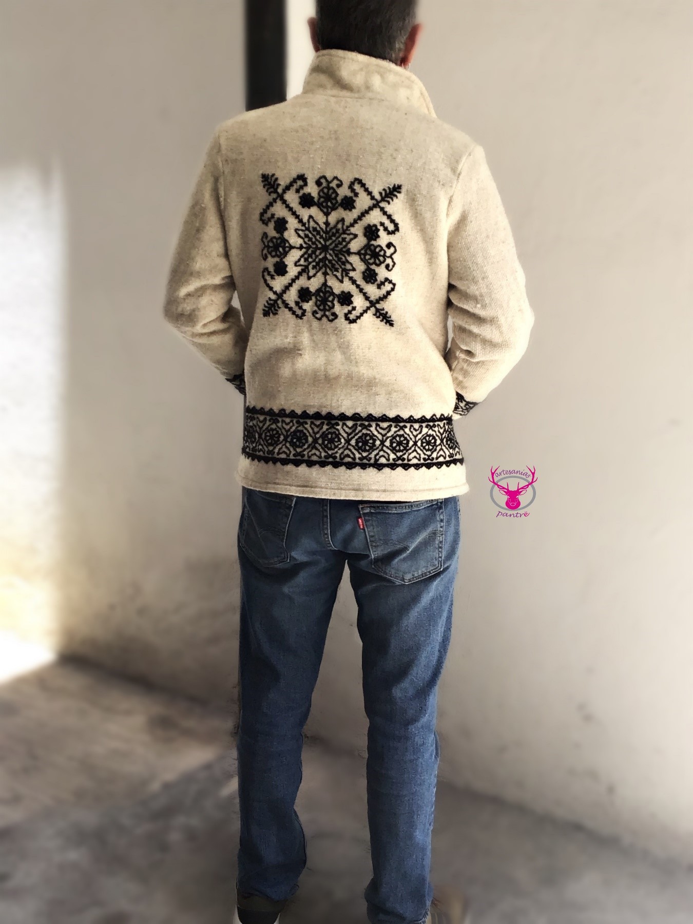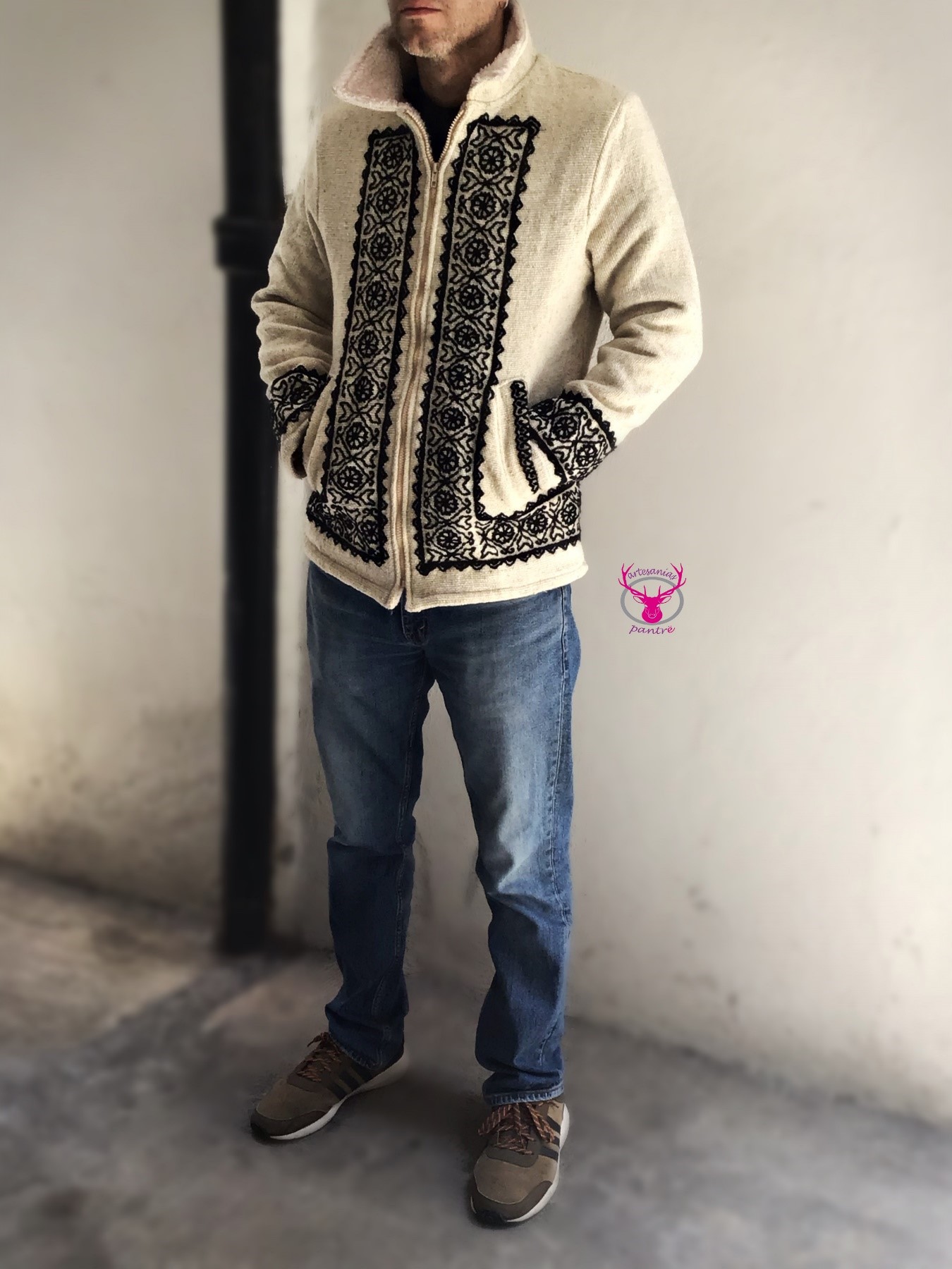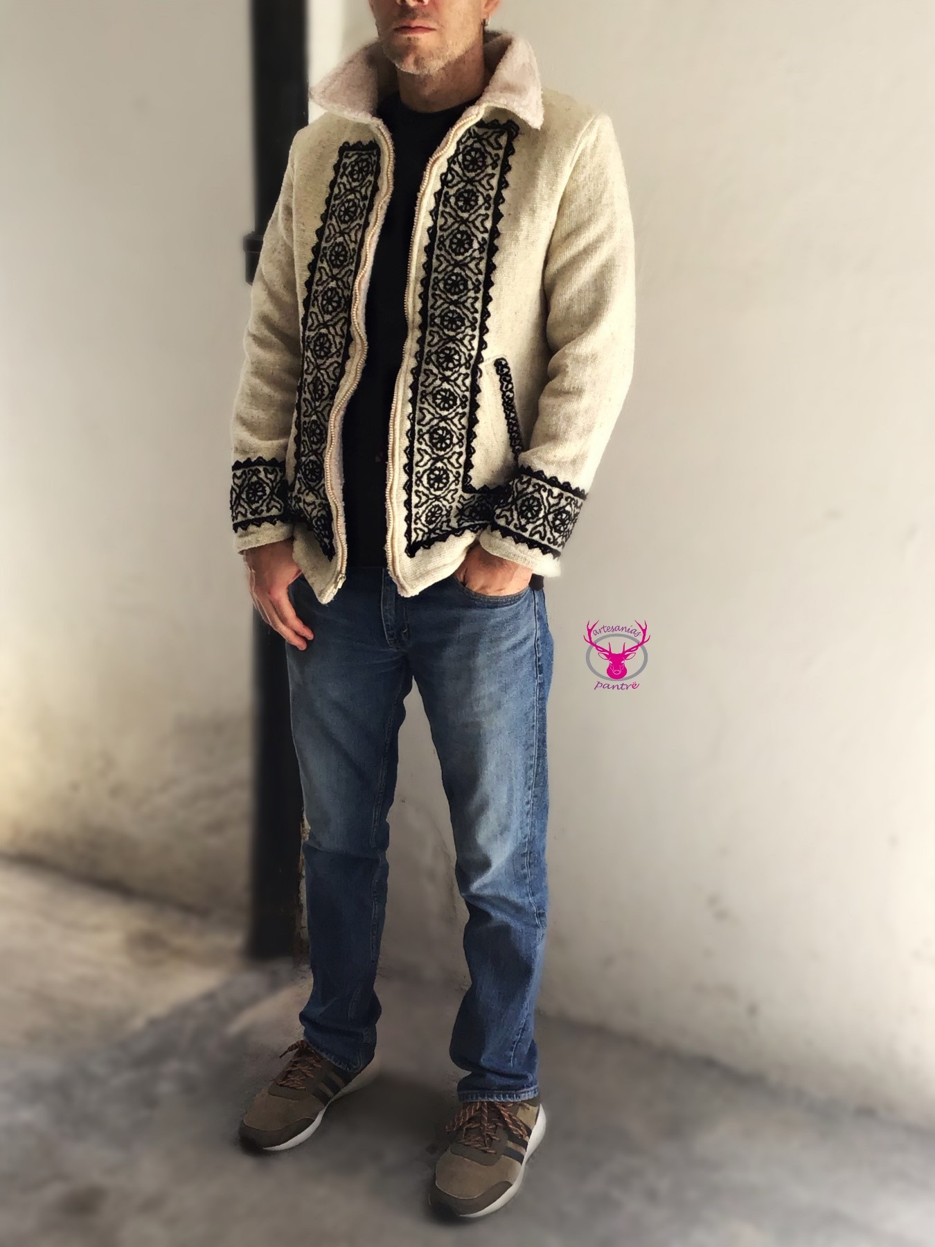 Chamarra aborregada, elaborada en telar de cintura y bordada totalmente a mano. Elaborado por manos indígenas Mazahuas, en acrilana o lana natural.