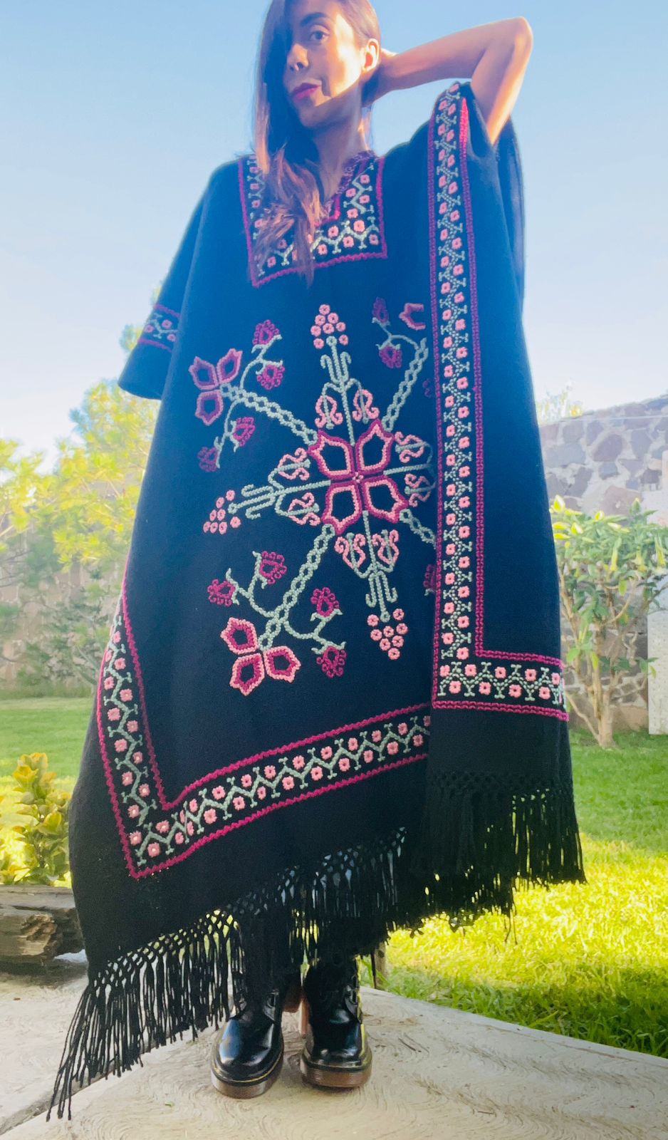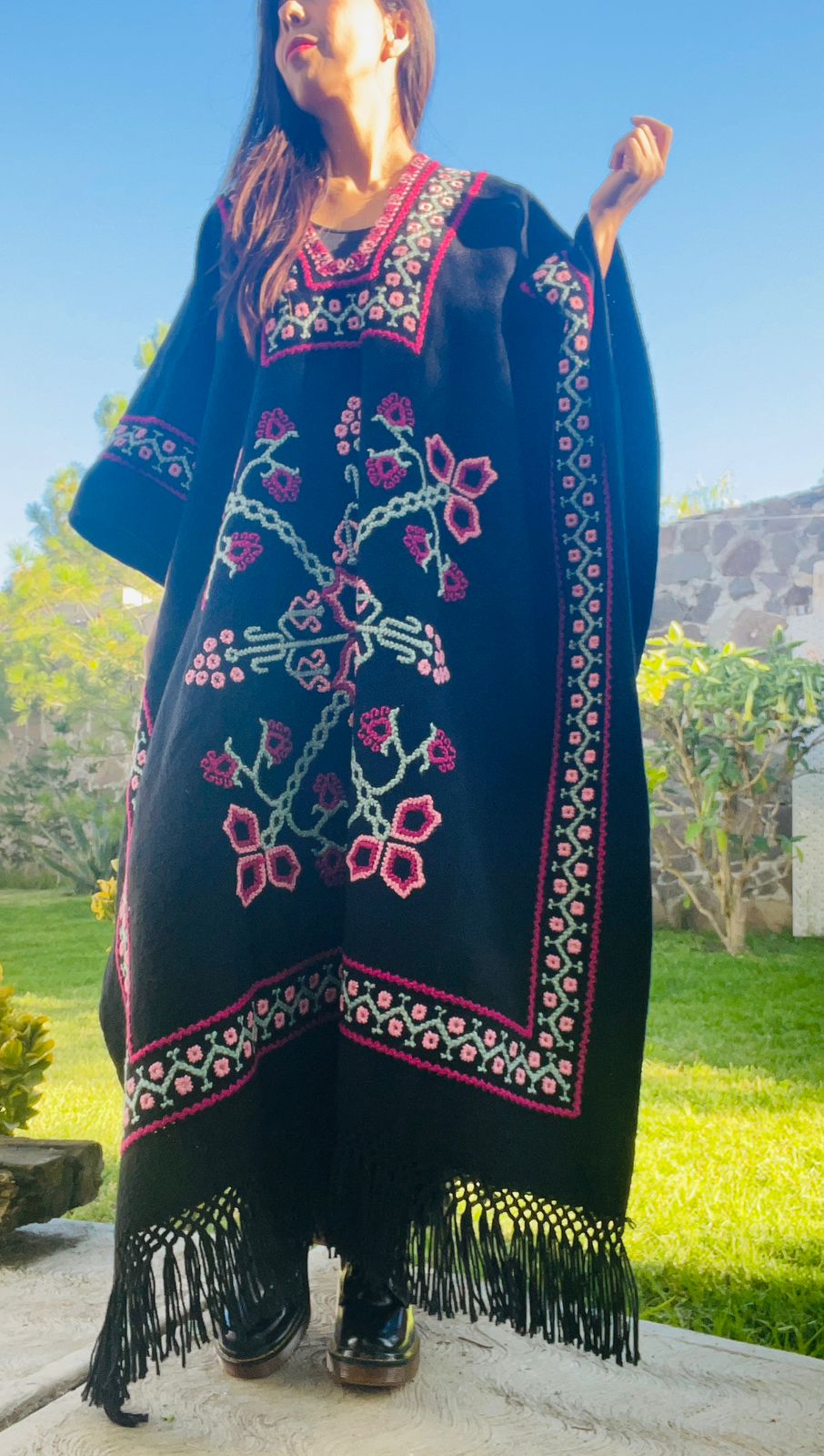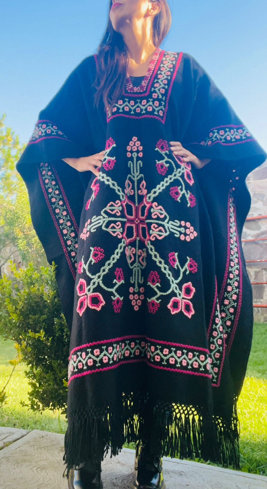 Elaborado en telar de pedal en lana natural y bordado a mano.