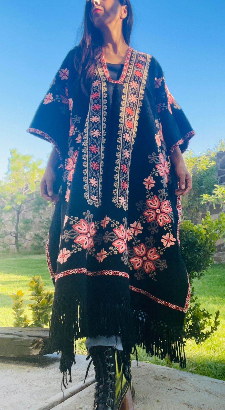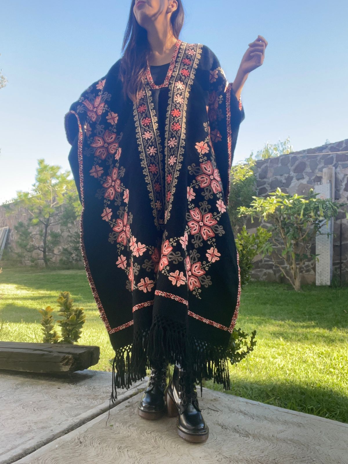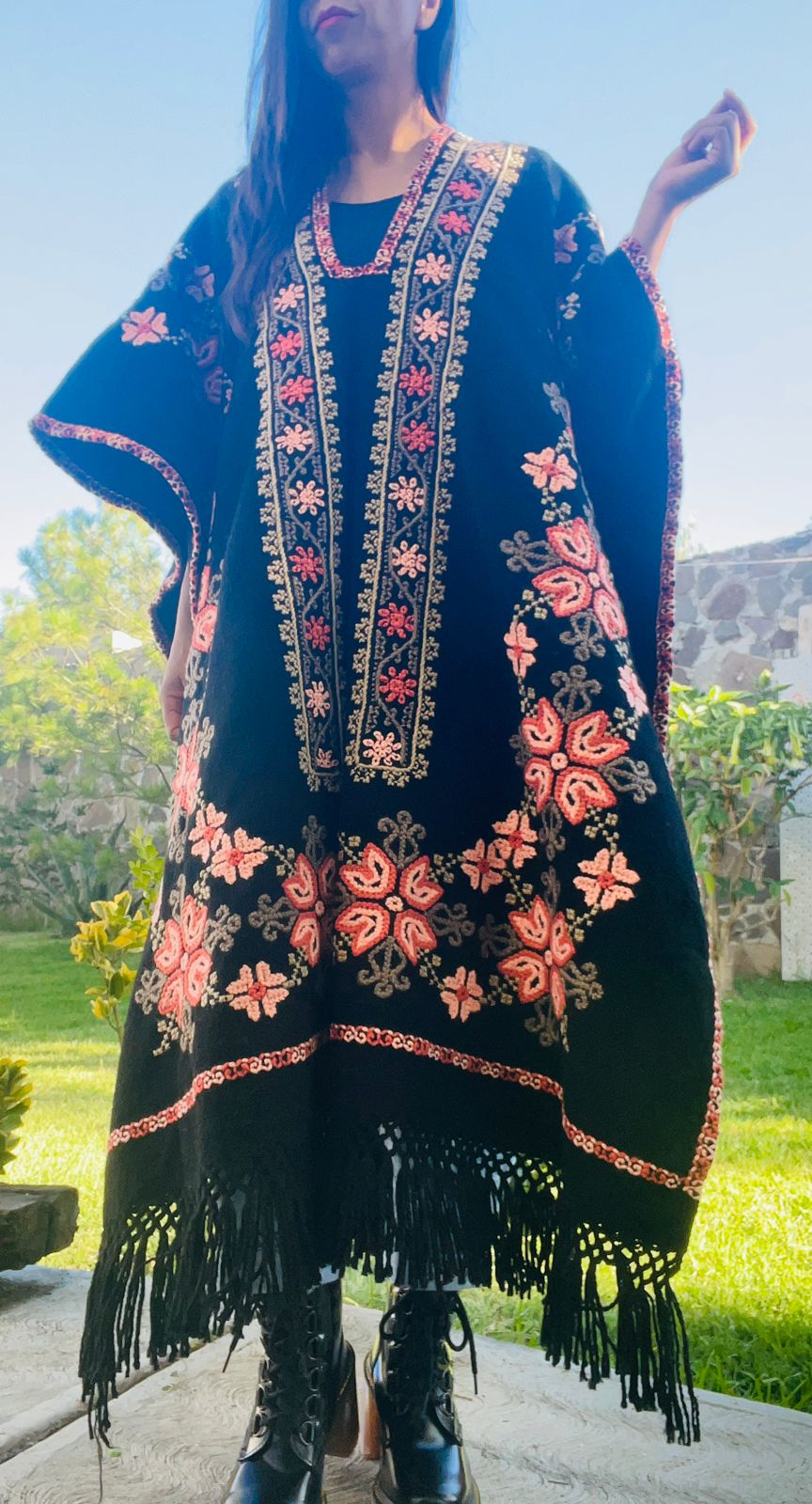 Elaborado en telar de pedal en lana natural y bordado a mano.